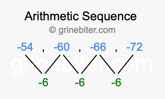 So, what type of sequence is -54, -60, -66, -72? The sequence -54, -60, -66, -72 has a common difference of -6 between each term. We call this kind of sequence an arithmetic sequence. Below is an image illustrating the correlation between the arithmetic sequence -54, -60, -66, -72 and its common difference of -6.