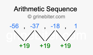 So, what type of sequence is -56, -37, -18, 1? The sequence -56, -37, -18, 1 has a common difference of +19 between each term. We call this kind of sequence an arithmetic sequence. Below is an image illustrating the correlation between the arithmetic sequence -56, -37, -18, 1 and its common difference of +19.