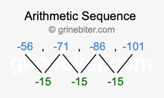 So, what type of sequence is -56, -71, -86, -101? The sequence -56, -71, -86, -101 has a common difference of -15 between each term. We call this kind of sequence an arithmetic sequence. Below is an image illustrating the correlation between the arithmetic sequence -56, -71, -86, -101 and its common difference of -15.