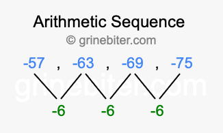 So, what type of sequence is -57, -63, -69, -75? The sequence -57, -63, -69, -75 has a common difference of -6 between each term. We call this kind of sequence an arithmetic sequence. Below is an image illustrating the correlation between the arithmetic sequence -57, -63, -69, -75 and its common difference of -6.