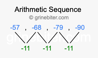 So, what type of sequence is -57, -68, -79, -90? The sequence -57, -68, -79, -90 has a common difference of -11 between each term. We call this kind of sequence an arithmetic sequence. Below is an image illustrating the correlation between the arithmetic sequence -57, -68, -79, -90 and its common difference of -11.