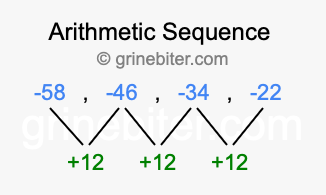 So, what type of sequence is -58, -46, -34, -22? The sequence -58, -46, -34, -22 has a common difference of +12 between each term. We call this kind of sequence an arithmetic sequence. Below is an image illustrating the correlation between the arithmetic sequence -58, -46, -34, -22 and its common difference of +12.