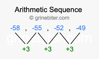 So, what type of sequence is -58, -55, -52, -49? The sequence -58, -55, -52, -49 has a common difference of +3 between each term. We call this kind of sequence an arithmetic sequence. Below is an image illustrating the correlation between the arithmetic sequence -58, -55, -52, -49 and its common difference of +3.