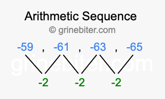 So, what type of sequence is -59, -61, -63, -65? The sequence -59, -61, -63, -65 has a common difference of -2 between each term. We call this kind of sequence an arithmetic sequence. Below is an image illustrating the correlation between the arithmetic sequence -59, -61, -63, -65 and its common difference of -2.