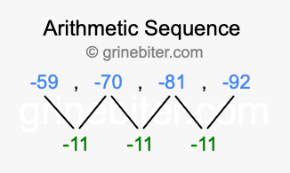 So, what type of sequence is -59, -70, -81, -92? The sequence -59, -70, -81, -92 has a common difference of -11 between each term. We call this kind of sequence an arithmetic sequence. Below is an image illustrating the correlation between the arithmetic sequence -59, -70, -81, -92 and its common difference of -11.
