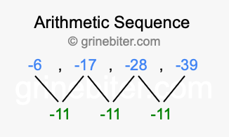 So, what type of sequence is -6, -17, -28, -39? The sequence -6, -17, -28, -39 has a common difference of -11 between each term. We call this kind of sequence an arithmetic sequence. Below is an image illustrating the correlation between the arithmetic sequence -6, -17, -28, -39 and its common difference of -11.