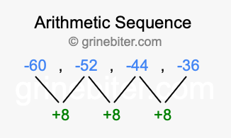 So, what type of sequence is -60, -52, -44, -36? The sequence -60, -52, -44, -36 has a common difference of +8 between each term. We call this kind of sequence an arithmetic sequence. Below is an image illustrating the correlation between the arithmetic sequence -60, -52, -44, -36 and its common difference of +8.