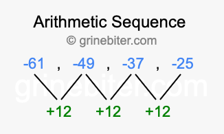 So, what type of sequence is -61, -49, -37, -25? The sequence -61, -49, -37, -25 has a common difference of +12 between each term. We call this kind of sequence an arithmetic sequence. Below is an image illustrating the correlation between the arithmetic sequence -61, -49, -37, -25 and its common difference of +12.