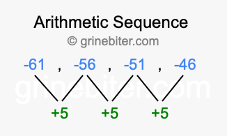 So, what type of sequence is -61, -56, -51, -46? The sequence -61, -56, -51, -46 has a common difference of +5 between each term. We call this kind of sequence an arithmetic sequence. Below is an image illustrating the correlation between the arithmetic sequence -61, -56, -51, -46 and its common difference of +5.