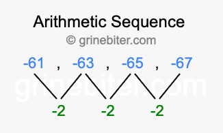 So, what type of sequence is -61, -63, -65, -67? The sequence -61, -63, -65, -67 has a common difference of -2 between each term. We call this kind of sequence an arithmetic sequence. Below is an image illustrating the correlation between the arithmetic sequence -61, -63, -65, -67 and its common difference of -2.