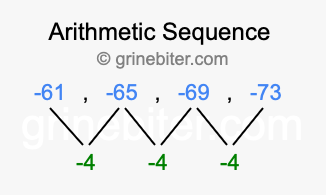 So, what type of sequence is -61, -65, -69, -73? The sequence -61, -65, -69, -73 has a common difference of -4 between each term. We call this kind of sequence an arithmetic sequence. Below is an image illustrating the correlation between the arithmetic sequence -61, -65, -69, -73 and its common difference of -4.
