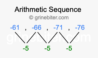 So, what type of sequence is -61, -66, -71, -76? The sequence -61, -66, -71, -76 has a common difference of -5 between each term. We call this kind of sequence an arithmetic sequence. Below is an image illustrating the correlation between the arithmetic sequence -61, -66, -71, -76 and its common difference of -5.