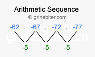 So, what type of sequence is -62, -67, -72, -77? The sequence -62, -67, -72, -77 has a common difference of -5 between each term. We call this kind of sequence an arithmetic sequence. Below is an image illustrating the correlation between the arithmetic sequence -62, -67, -72, -77 and its common difference of -5.