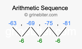So, what type of sequence is -63, -69, -75, -81? The sequence -63, -69, -75, -81 has a common difference of -6 between each term. We call this kind of sequence an arithmetic sequence. Below is an image illustrating the correlation between the arithmetic sequence -63, -69, -75, -81 and its common difference of -6.