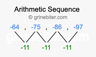 So, what type of sequence is -64, -75, -86, -97? The sequence -64, -75, -86, -97 has a common difference of -11 between each term. We call this kind of sequence an arithmetic sequence. Below is an image illustrating the correlation between the arithmetic sequence -64, -75, -86, -97 and its common difference of -11.