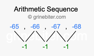 So, what type of sequence is -65, -66, -67, -68? The sequence -65, -66, -67, -68 has a common difference of -1 between each term. We call this kind of sequence an arithmetic sequence. Below is an image illustrating the correlation between the arithmetic sequence -65, -66, -67, -68 and its common difference of -1.