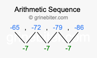 So, what type of sequence is -65, -72, -79, -86? The sequence -65, -72, -79, -86 has a common difference of -7 between each term. We call this kind of sequence an arithmetic sequence. Below is an image illustrating the correlation between the arithmetic sequence -65, -72, -79, -86 and its common difference of -7.