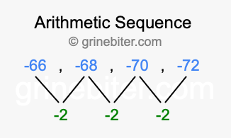So, what type of sequence is -66, -68, -70, -72? The sequence -66, -68, -70, -72 has a common difference of -2 between each term. We call this kind of sequence an arithmetic sequence. Below is an image illustrating the correlation between the arithmetic sequence -66, -68, -70, -72 and its common difference of -2.