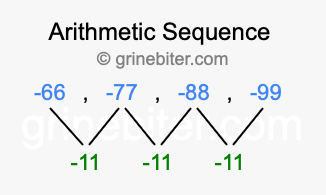 So, what type of sequence is -66, -77, -88, -99? The sequence -66, -77, -88, -99 has a common difference of -11 between each term. We call this kind of sequence an arithmetic sequence. Below is an image illustrating the correlation between the arithmetic sequence -66, -77, -88, -99 and its common difference of -11.