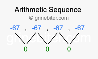As stated above, the common difference (d) between each term is 0. Furthermore, the next term in -67, -67, -67, -67 is the fifth term (5), and the first term is -67. When we enter these values into our formula, we get the following answer: