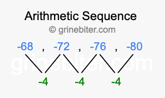 So, what type of sequence is -68, -72, -76, -80? The sequence -68, -72, -76, -80 has a common difference of -4 between each term. We call this kind of sequence an arithmetic sequence. Below is an image illustrating the correlation between the arithmetic sequence -68, -72, -76, -80 and its common difference of -4.