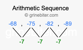 So, what type of sequence is -68, -75, -82, -89? The sequence -68, -75, -82, -89 has a common difference of -7 between each term. We call this kind of sequence an arithmetic sequence. Below is an image illustrating the correlation between the arithmetic sequence -68, -75, -82, -89 and its common difference of -7.