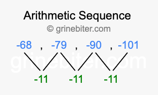 So, what type of sequence is -68, -79, -90, -101? The sequence -68, -79, -90, -101 has a common difference of -11 between each term. We call this kind of sequence an arithmetic sequence. Below is an image illustrating the correlation between the arithmetic sequence -68, -79, -90, -101 and its common difference of -11.