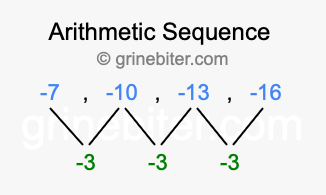 So, what type of sequence is -7, -10, -13, -16? The sequence -7, -10, -13, -16 has a common difference of -3 between each term. We call this kind of sequence an arithmetic sequence. Below is an image illustrating the correlation between the arithmetic sequence -7, -10, -13, -16 and its common difference of -3.