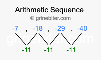 So, what type of sequence is -7, -18, -29, -40? The sequence -7, -18, -29, -40 has a common difference of -11 between each term. We call this kind of sequence an arithmetic sequence. Below is an image illustrating the correlation between the arithmetic sequence -7, -18, -29, -40 and its common difference of -11.