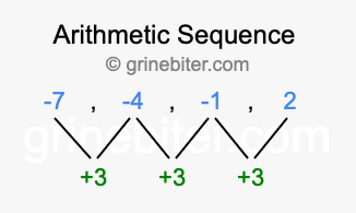 So, what type of sequence is -7, -4, -1, 2? The sequence -7, -4, -1, 2 has a common difference of +3 between each term. We call this kind of sequence an arithmetic sequence. Below is an image illustrating the correlation between the arithmetic sequence -7, -4, -1, 2 and its common difference of +3.