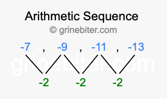 So, what type of sequence is -7, -9, -11, -13? The sequence -7, -9, -11, -13 has a common difference of -2 between each term. We call this kind of sequence an arithmetic sequence. Below is an image illustrating the correlation between the arithmetic sequence -7, -9, -11, -13 and its common difference of -2.