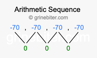 So, what type of sequence is -70, -70, -70, -70? The sequence -70, -70, -70, -70 has a common difference of 0 between each term. We call this kind of sequence an arithmetic sequence. Below is an image illustrating the correlation between the arithmetic sequence -70, -70, -70, -70 and its common difference of 0.