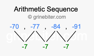 So, what type of sequence is -70, -77, -84, -91? The sequence -70, -77, -84, -91 has a common difference of -7 between each term. We call this kind of sequence an arithmetic sequence. Below is an image illustrating the correlation between the arithmetic sequence -70, -77, -84, -91 and its common difference of -7.
