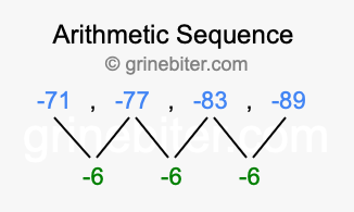 So, what type of sequence is -71, -77, -83, -89? The sequence -71, -77, -83, -89 has a common difference of -6 between each term. We call this kind of sequence an arithmetic sequence. Below is an image illustrating the correlation between the arithmetic sequence -71, -77, -83, -89 and its common difference of -6.