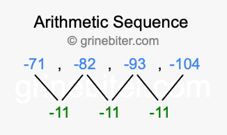 So, what type of sequence is -71, -82, -93, -104? The sequence -71, -82, -93, -104 has a common difference of -11 between each term. We call this kind of sequence an arithmetic sequence. Below is an image illustrating the correlation between the arithmetic sequence -71, -82, -93, -104 and its common difference of -11.