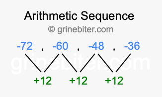 So, what type of sequence is -72, -60, -48, -36? The sequence -72, -60, -48, -36 has a common difference of +12 between each term. We call this kind of sequence an arithmetic sequence. Below is an image illustrating the correlation between the arithmetic sequence -72, -60, -48, -36 and its common difference of +12.