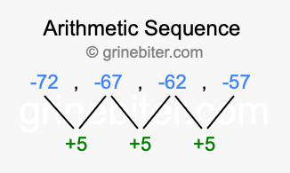 So, what type of sequence is -72, -67, -62, -57? The sequence -72, -67, -62, -57 has a common difference of +5 between each term. We call this kind of sequence an arithmetic sequence. Below is an image illustrating the correlation between the arithmetic sequence -72, -67, -62, -57 and its common difference of +5.