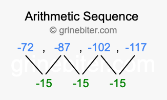 So, what type of sequence is -72, -87, -102, -117? The sequence -72, -87, -102, -117 has a common difference of -15 between each term. We call this kind of sequence an arithmetic sequence. Below is an image illustrating the correlation between the arithmetic sequence -72, -87, -102, -117 and its common difference of -15.