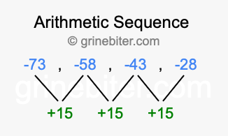 So, what type of sequence is -73, -58, -43, -28? The sequence -73, -58, -43, -28 has a common difference of +15 between each term. We call this kind of sequence an arithmetic sequence. Below is an image illustrating the correlation between the arithmetic sequence -73, -58, -43, -28 and its common difference of +15.