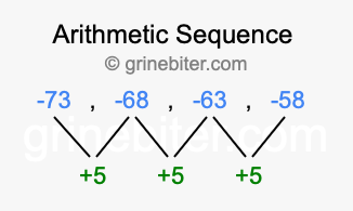 So, what type of sequence is -73, -68, -63, -58? The sequence -73, -68, -63, -58 has a common difference of +5 between each term. We call this kind of sequence an arithmetic sequence. Below is an image illustrating the correlation between the arithmetic sequence -73, -68, -63, -58 and its common difference of +5.