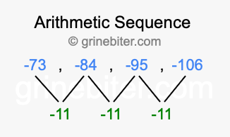 So, what type of sequence is -73, -84, -95, -106? The sequence -73, -84, -95, -106 has a common difference of -11 between each term. We call this kind of sequence an arithmetic sequence. Below is an image illustrating the correlation between the arithmetic sequence -73, -84, -95, -106 and its common difference of -11.