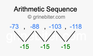 So, what type of sequence is -73, -88, -103, -118? The sequence -73, -88, -103, -118 has a common difference of -15 between each term. We call this kind of sequence an arithmetic sequence. Below is an image illustrating the correlation between the arithmetic sequence -73, -88, -103, -118 and its common difference of -15.