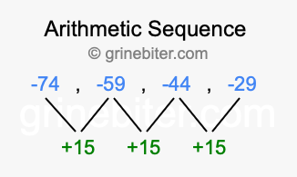 So, what type of sequence is -74, -59, -44, -29? The sequence -74, -59, -44, -29 has a common difference of +15 between each term. We call this kind of sequence an arithmetic sequence. Below is an image illustrating the correlation between the arithmetic sequence -74, -59, -44, -29 and its common difference of +15.