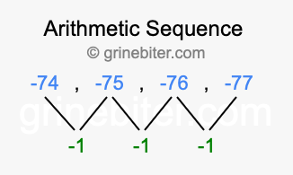 So, what type of sequence is -74, -75, -76, -77? The sequence -74, -75, -76, -77 has a common difference of -1 between each term. We call this kind of sequence an arithmetic sequence. Below is an image illustrating the correlation between the arithmetic sequence -74, -75, -76, -77 and its common difference of -1.
