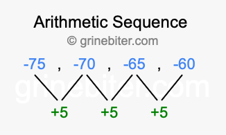 So, what type of sequence is -75, -70, -65, -60? The sequence -75, -70, -65, -60 has a common difference of +5 between each term. We call this kind of sequence an arithmetic sequence. Below is an image illustrating the correlation between the arithmetic sequence -75, -70, -65, -60 and its common difference of +5.