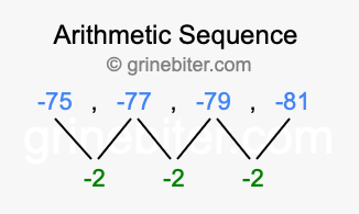 So, what type of sequence is -75, -77, -79, -81? The sequence -75, -77, -79, -81 has a common difference of -2 between each term. We call this kind of sequence an arithmetic sequence. Below is an image illustrating the correlation between the arithmetic sequence -75, -77, -79, -81 and its common difference of -2.