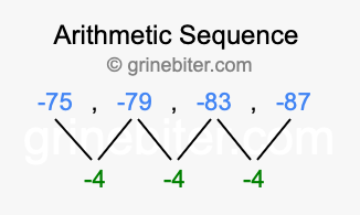 So, what type of sequence is -75, -79, -83, -87? The sequence -75, -79, -83, -87 has a common difference of -4 between each term. We call this kind of sequence an arithmetic sequence. Below is an image illustrating the correlation between the arithmetic sequence -75, -79, -83, -87 and its common difference of -4.