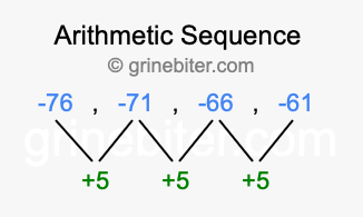 So, what type of sequence is -76, -71, -66, -61? The sequence -76, -71, -66, -61 has a common difference of +5 between each term. We call this kind of sequence an arithmetic sequence. Below is an image illustrating the correlation between the arithmetic sequence -76, -71, -66, -61 and its common difference of +5.