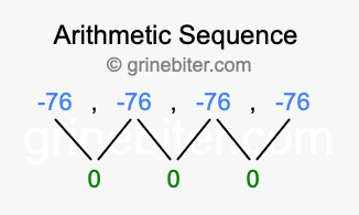 So, what type of sequence is -76, -76, -76, -76? The sequence -76, -76, -76, -76 has a common difference of 0 between each term. We call this kind of sequence an arithmetic sequence. Below is an image illustrating the correlation between the arithmetic sequence -76, -76, -76, -76 and its common difference of 0.