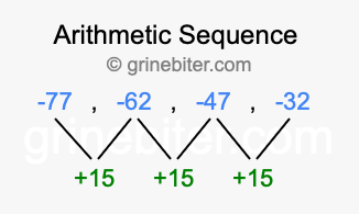 So, what type of sequence is -77, -62, -47, -32? The sequence -77, -62, -47, -32 has a common difference of +15 between each term. We call this kind of sequence an arithmetic sequence. Below is an image illustrating the correlation between the arithmetic sequence -77, -62, -47, -32 and its common difference of +15.